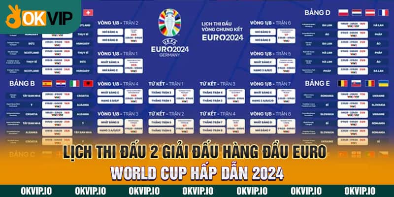 Lịch thi đấu của 2 đấu trường bóng đá lớn nhất Euro – World Cup là nội dung mà người hâm mộ cực kỳ quan tâm. Nhờ vào thông tin cụ thể về thời gian của từng trận đấu giúp khán giả có thể thuận tiện theo dõi cũng như cổ vũ cho đội bóng mình yêu thích. OKVIP sẽ mang đến cho người hâm mộ thông tin cụ thể ở bài sau.